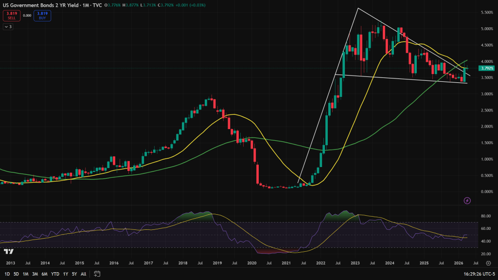 U.S. 10-year Govt Bond Yields – Monthly candles: Consolidating within a higher base triangle formation, which usually would breakout on the upside. We would wait till that happens.